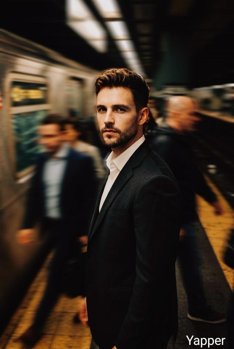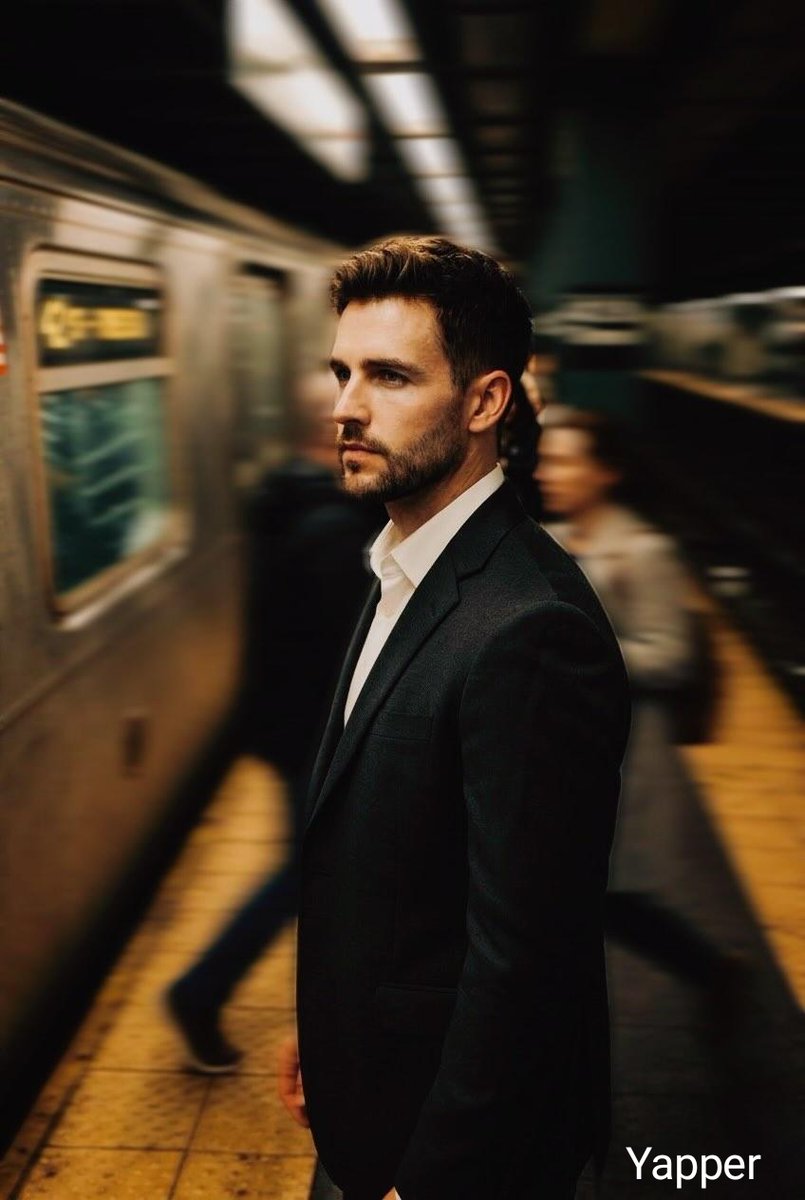 Cinematic portrait of a serious man in a black suit and white shirt standing on a busy subway platform beside a train, the man sharply in focus while commuters move quickly around him creating strong motion blur, dramatic urban atmosphere, warm subway lighting reflecting on metallic train surfaces, shallow depth of field, dynamic motion effect, cinematic photography, intense expression, modern thriller movie scene aesthetic, ultra-realistic, high detail, 8K, film still look.