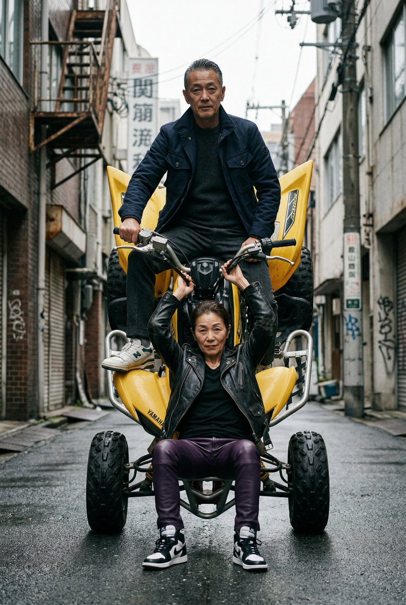 A cinematic urban street scene featuring a yellow Yamaha quad bike performing a vertical wheelie on a wet city alley pavement. A 60-year-old Asian man sits confidently on top of the raised quad, wearing a refined casual chic streetwear outfit — tailored jacket, relaxed trousers, and clean sneakers. His posture is relaxed yet controlled, exuding quiet authority. Below him, hanging from the quad, a 60-year-old Asian woman with strong character is positioned with effortless attitude. She wears a black leather biker jacket (perfecto), fitted purple leather pants, and Air Jordan 1 sneakers. Her expression is calm, confident, slightly rebellious. The environment is gritty and realistic: damp pavement, industrial buildings, muted tones, soft overcast daylight. Shot from a low angle to emphasize power and verticality, with dynamic perspective distortion. Cinematic color grading, subtle film grain, ultra-realistic textures, shallow depth of field.
