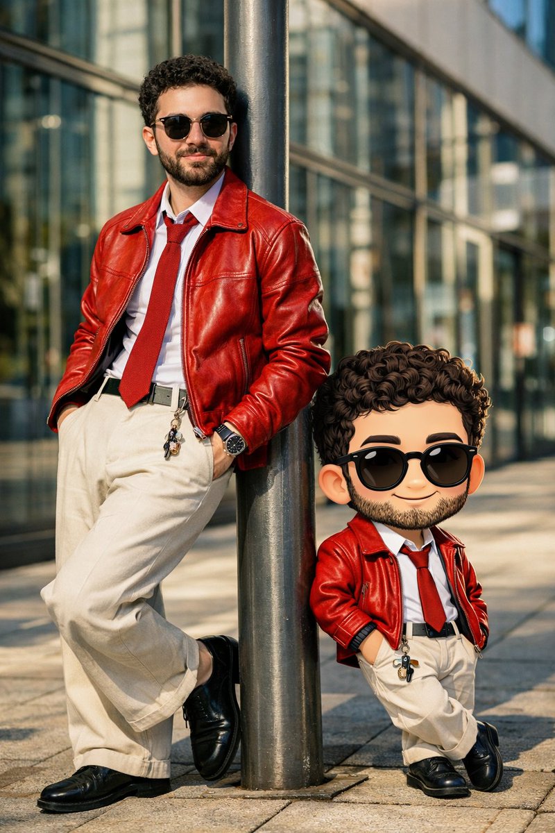 "relationship": "Mirrors the real person's outfit and pose, leaning against the same pole on the other side",