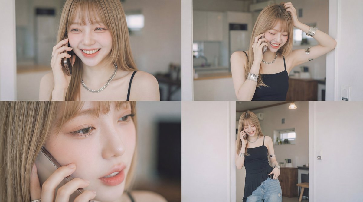 A cinematic video of a woman happily conversing on her mobile phone. Using soft tones and shallow depth of field, capture her lovely expression, smile, and delicate gestures in close-up. Emphasize intimacy with the natural movement of a handheld camera, creating a calm and happy atmosphere where whispers and breathing can be felt.