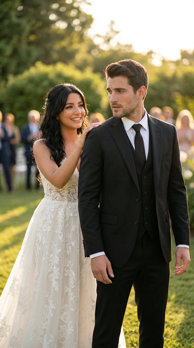 "pose": "groom turning, bride approaching softly"