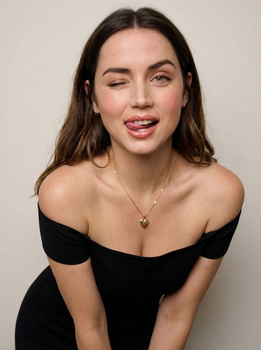 "pose":"leaning slightly forward, shoulders angled, playful expression with one eye wink and tongue slightly out",