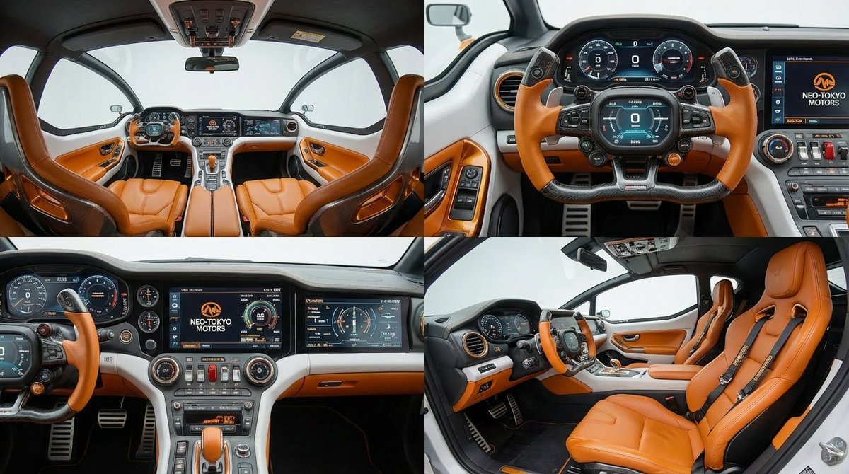 Nano Banana Pro AI image example generated with this reusable CDance AI prompt: A prompt for generating a realistic 2x2 grid showing various angles of a detailed vehicle cockpit interior, including steering wheel and…