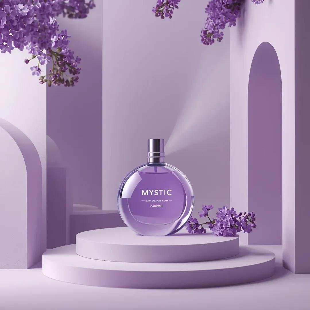 Ultra-realistic commercial product photography of a “{argument name="perfume name" default="Mystic Eau De Parfum"}” perfume bottle filled with translucent violet liquid, the round glass bottle centered and placed on a soft pastel surface with the metallic cap set beside it, surrounded by a minimal architectural setup of smooth lavender and white geometric arches and stepped platforms, delicate purple lilac flowers arranged around and above the scene adding a natural botanical touch, a subtle mist spray visible in the air near the bottle suggesting fragrance diffusion, monochromatic purple color palette with soft gradients in the background, clean studio environment with elegant symmetry, soft diffused lighting creating gentle shadows and smooth reflections on the glass surface, balanced composition with the product as the focal point and background elements slightly softened, high-end beauty advertising aesthetic emphasizing elegance and calm luxury, high detail, realistic textures, professional photography, high resolution, sharp focus.Related Nano Banana Pro Prompts