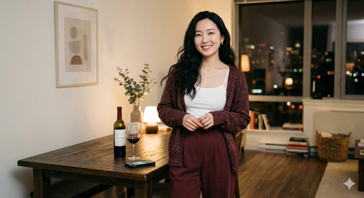 Generate image: {argument name="character description" default="young Asian beauty, cool white skin beauty, long black curly hair"}, wearing {argument name="attire" default="white camisole + wine red mottled cardigan + wine red long pants"}, standing in {argument name="setting" default="simple indoor scene (red wine + phone on the table), simple hanging painting on the background wall"}, {argument name="lighting and atmosphere" default="night scene, dim indoor light, medium shot composition, lazy and casual daily wear atmosphere, realistic and natural image details"}.Related Nano Banana Pro Prompts