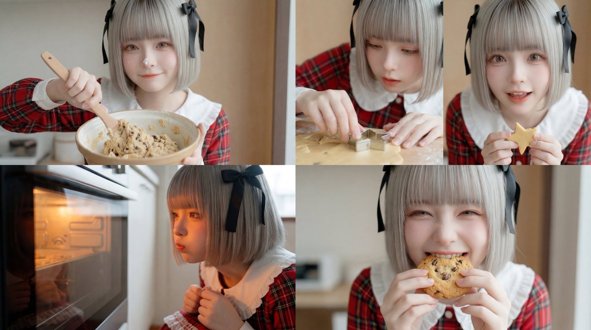 Mixing cookie dough, shyly smiling with flour on the nose, natural light, cinematic pan-up. Cutting out cookies, succeeding and happily looking at the camera, shallow depth of field, close-up. Profile looking into the oven, impatient expression, warm orange light, medium shot. Eating freshly baked cookies, full happy smile, slow motion, cinematic.
