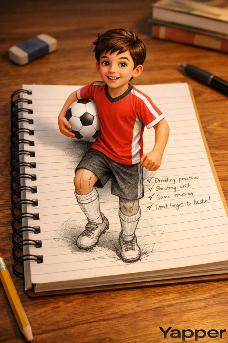 A structured prompt for generating a semi-realistic 3D cartoon image featuring a cute young boy stepping out of a spiral notebook, creating a 3D pop-out illusion where his lower body is a pencil sketch and his upper body is realistic.
