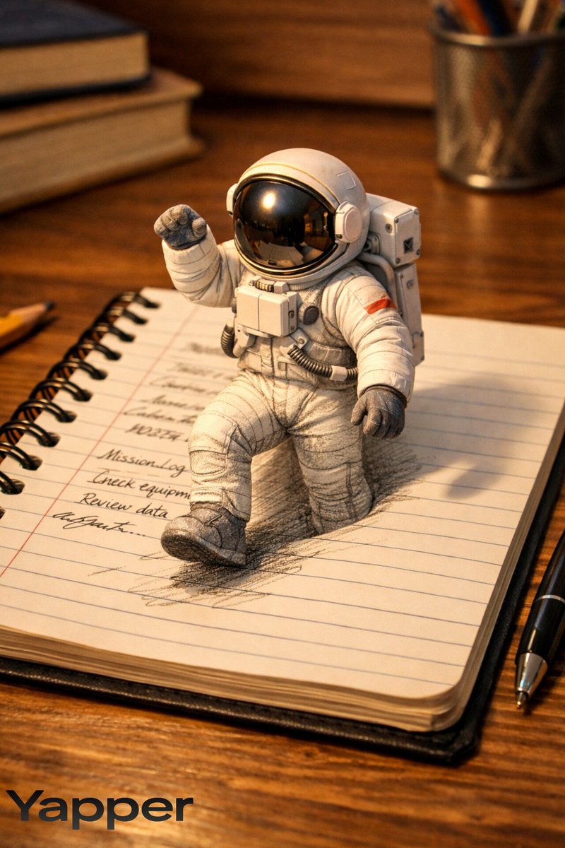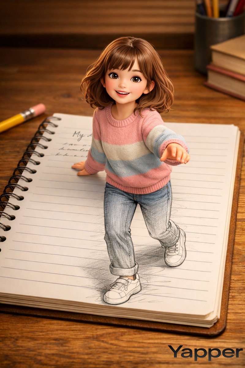 "prompt": "Creative 3D illusion artwork of a cute young boy stepping out of a spiral notebook placed on a wooden desk. The notebook has lined paper with some handwritten text at the top. The boy has soft messy brown hair, a fresh face, and a cheerful smile. He is wearing an oversized pastel t-shirt, light grey high-waisted jeans, and white sneakers. His lower body is drawn as a pencil sketch on the notebook page, while his upper body looks realistic and appears to pop out of the paper, creating a strong 3D illusion. Warm soft lighting, wooden desk texture, shallow depth of field, high detail.",