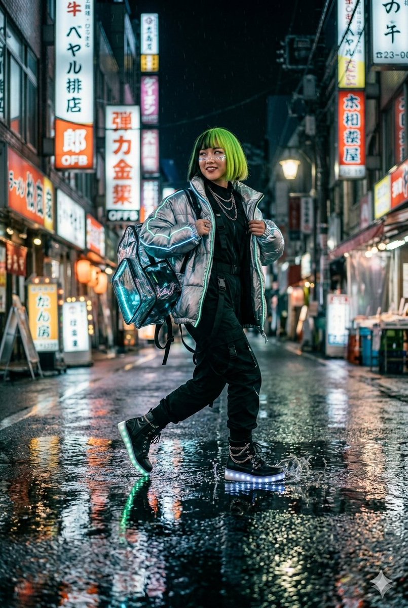 A complex cyberpunk prompt featuring a character in neon-lit techwear on a rainy Tokyo-inspired street.