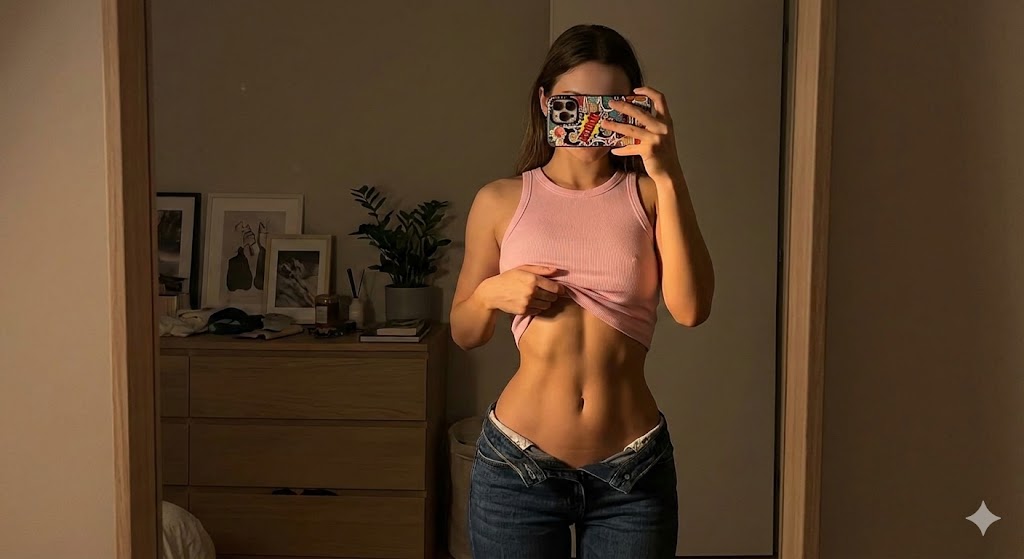 "pose": "Standing in front of a mirror, one hand lifting the hem of her top, the other holding a smartphone to her face, unbuttoned jeans sagging low on hips"