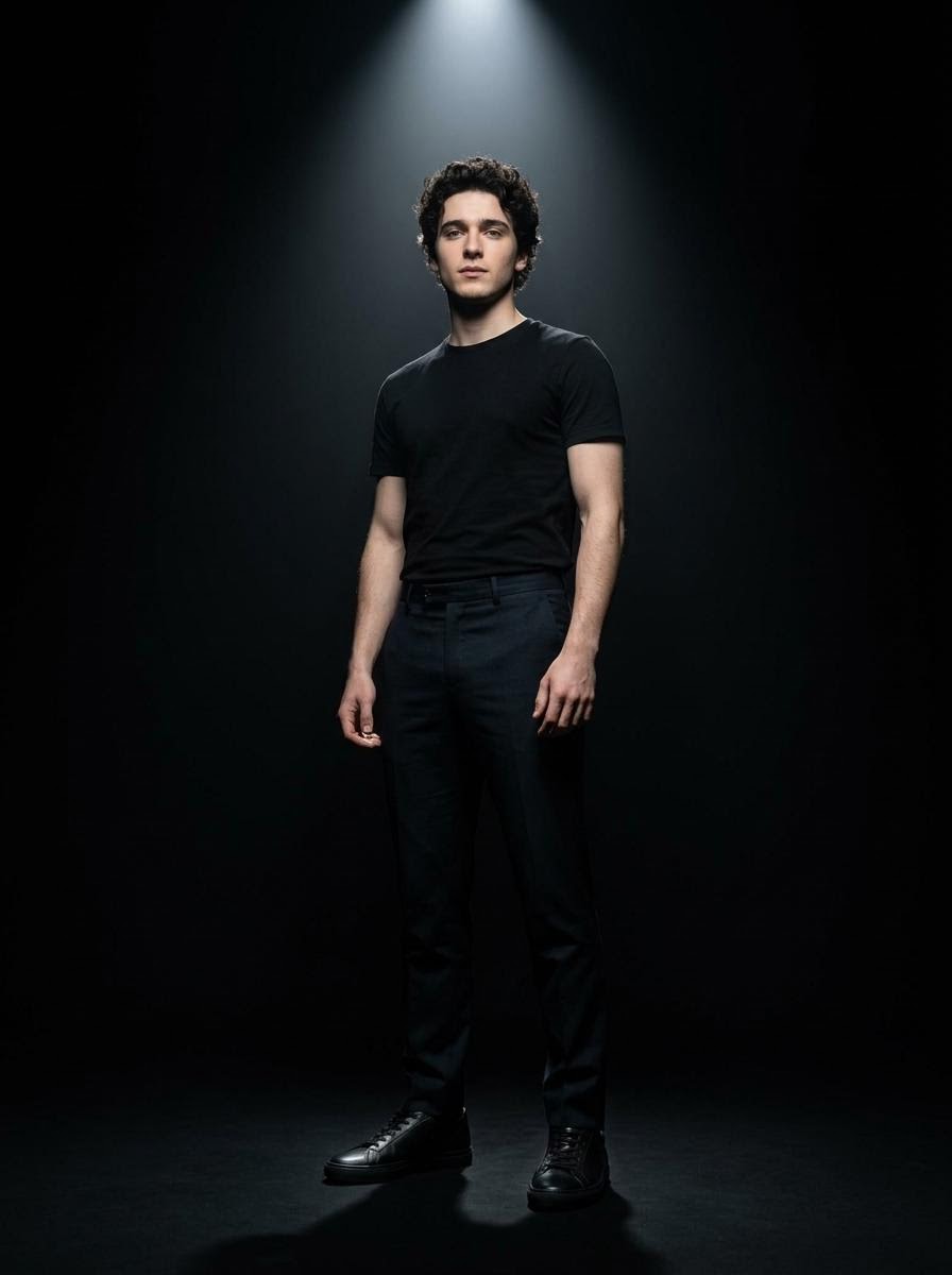 Create a realistic cinematic photo of a person using the face from the uploaded image. The person is standing in a clean, minimalist studio with a completely plain background (black, white, or soft grey). A single strong spotlight from above falls directly on the person, creating sharp shadows and a dramatic high-contrast look. The rest of the scene fades into darkness, keeping full focus on the subject. The camera angle is slightly low and centered, giving a powerful and premium feel. The person is wearing a stylish, minimal outfit such as a fitted t-shirt or shirt, tailored pants, and clean sneakers or shoes. Their pose is confident and calm, with natural body posture. Cinematic lighting, sharp shadows, luxury brand style, ultra realistic photography, high detail, professional fashion shoot look.