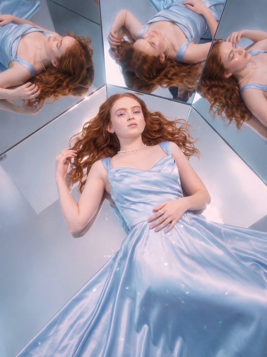 Nano Banana Pro AI image example generated with this reusable CDance AI prompt: A structured JSON prompt for Nano Banana Pro to generate a dreamy, reflective luxury editorial photoshoot image of a young woman lying on…