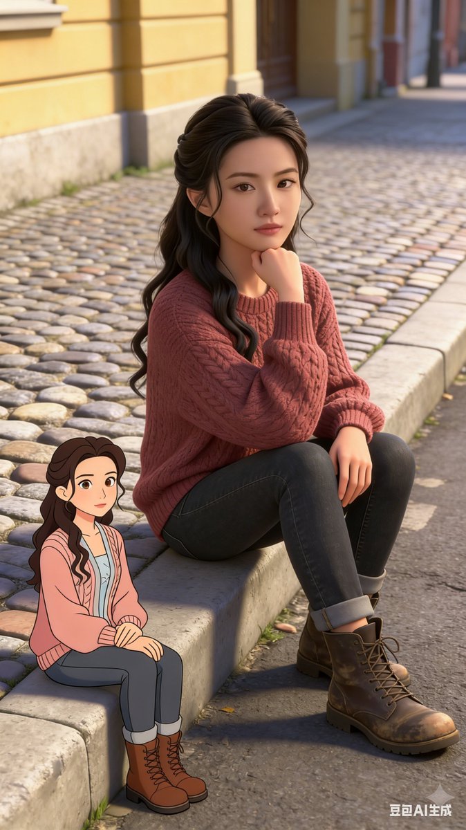 Generate an image for me: [Subject]: In the photo, a person **[Extract from uploaded image: age, gender, appearance features]** (identical to the person in the uploaded image) sits by a quiet city street. The person sits casually on the edge of the concrete sidewalk, resting one hand on their chin, appearing slightly bored and thoughtful. The expression is calm and reserved, conveying a sense of quiet contemplation. [Attire]: Wearing **{argument name="attire" default="a light burgundy loose cable-knit sweater, paired with dark jeans and distressed leather boots"}**. [Cartoon Companion]: Sitting on the sidewalk next to him/her is a cartoon version of themselves (with facial features consistent with the uploaded image). The cartoon character's clothing, appearance, posture, and even expression are exactly the same as the real person. The cartoon style features simple lines, warm colors, and a soft, hand-drawn animation look, creating an interesting contrast with the realistic person. [Technique and Environment]: The background is a richly textured cobblestone road and a soft yellow building facade. Earth tones dominate, with soft natural light. Blending street photography with mixed media art, Octane renderer, Unreal Engine quality, aspect ratio "9:16"Related Nano Banana Pro Prompts