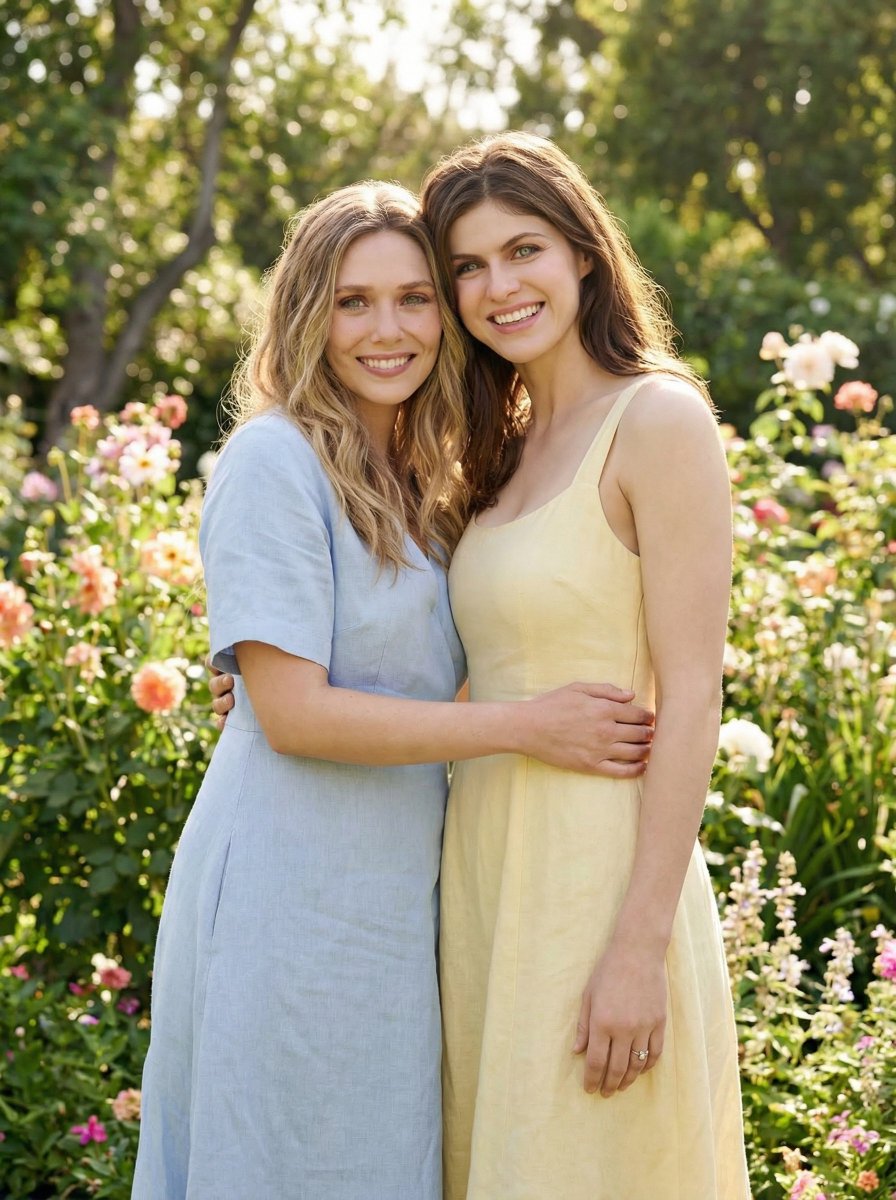"description": "{argument name="subject description" default="two young women standing outdoors together in a garden setting, smiling and posing side by side, wearing soft pastel dresses, Use uploaded reference image, keep identity exact"}",