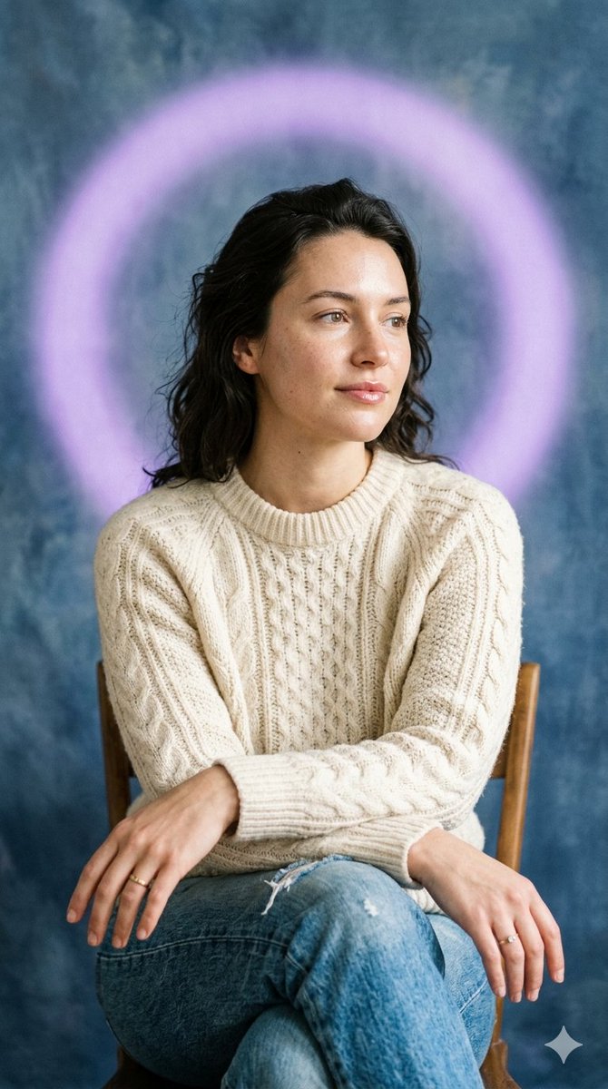 Studio portrait of a young woman seated cross-legged on a simple wooden stool, wearing a {argument name="top" default="light gray ribbed turtleneck sweater with subtle chevron knit detail"} and {argument name="bottom" default="relaxed high-waisted blue jeans"}, barefoot, one hand gently touching her cheek while the other rests on her knee, {argument name="hair style" default="long straight light brown hair"}, natural makeup, serene and introspective expression; soft, diffused studio lighting from the side creating gentle, flattering shadows and a soft rim, muted pastel color grading, texturedpainterly backdrop in desaturated blue with a large circular lavender-purple halo behind her, shallow depth of field, high-resolution editorial skincare/beauty ad aesthetic, calm, intimate mood, fine film-like grain and realistic skin texture, accurate fabric textures and subtle highlights on knit and denim.Related Nano Banana Pro Prompts