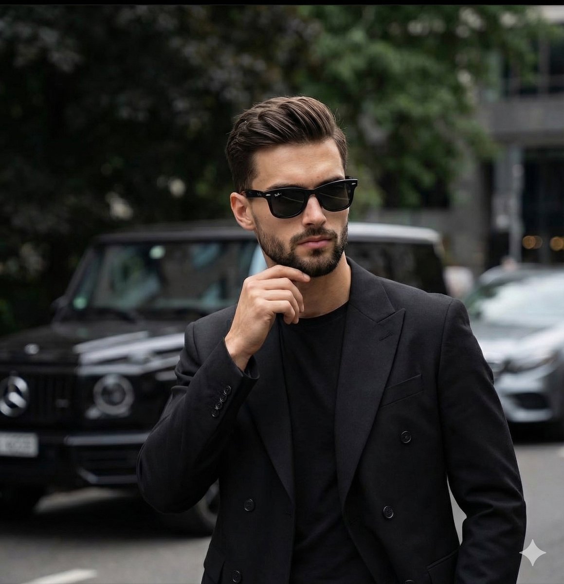 "visual_hierarchy": "Face/sunglasses -> hand gesture -> deep black lapels of the suit -> blurred vehicle in background",