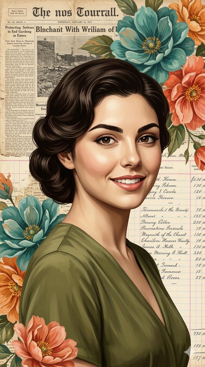 Digital illustration of a beautiful cute woman [ Use the uploaded photo as reference] with elegant features, dark wavy brown hair styled in a classic bun. She is wearing a olive green dress . The art style is a blend of vintage realism and collage, set against a background of aged, weathered newspaper clippings and antique ledger paper. Large, painterly floral blooms in shades of teal, orange, and coral frame the composition. High resolution, vertical portrait, 4K quality.