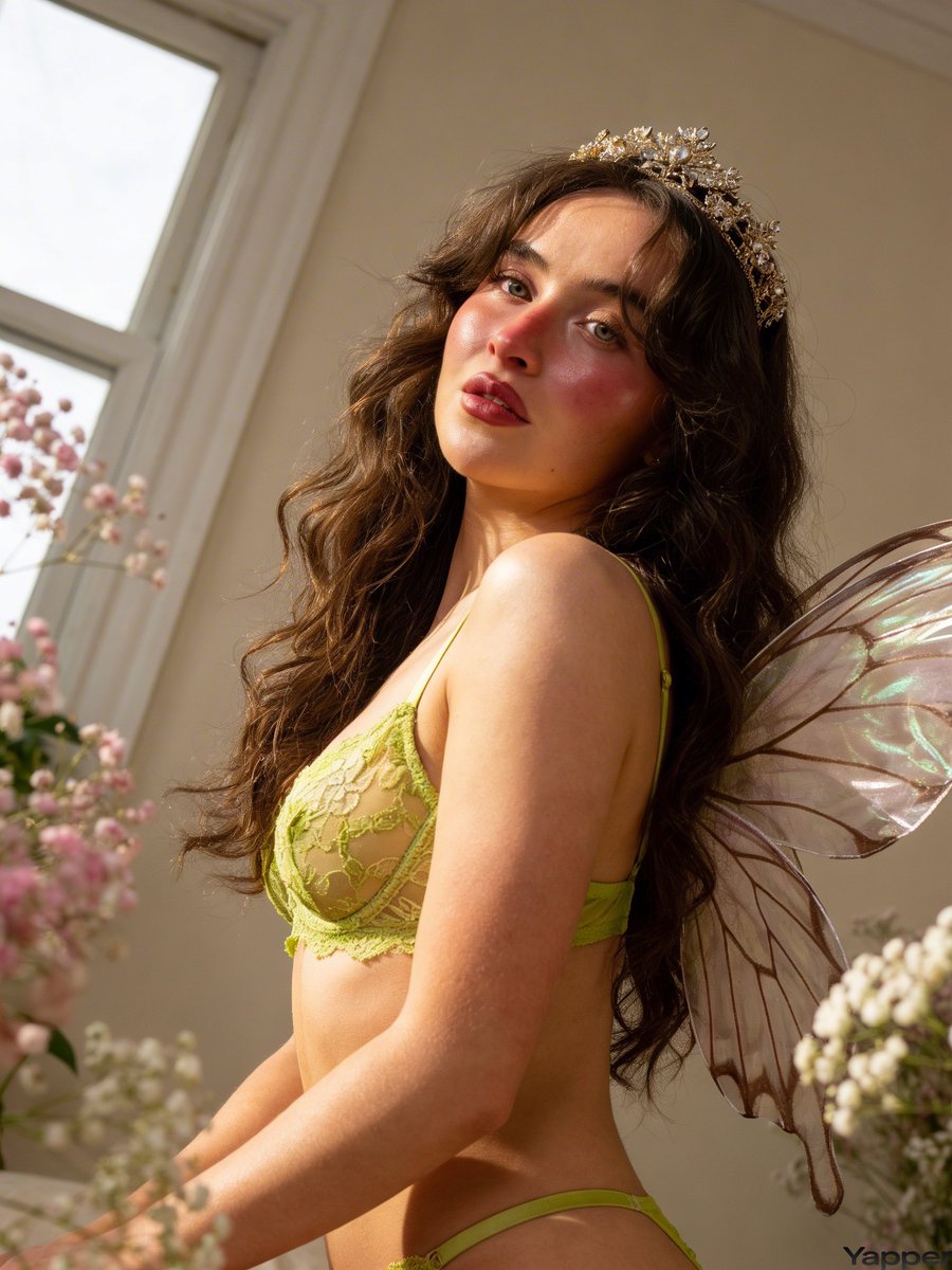 A highly detailed, JSON-formatted prompt for Nano Banana Pro to generate an ultra-photorealistic image of a young woman resembling Sabrina Carpenter in an ethereal fairy-core aesthetic, featuring lime-green lace lingerie, a floral tiara, and soft, warm 'golden hour' lighting.