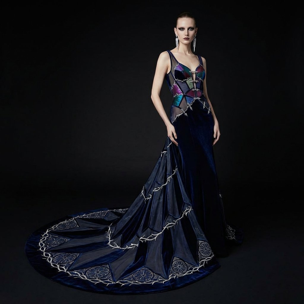 TRANSFER_MATRIX: peacock tail fan -> gown train expansion geometry cathedral stained glass -> bodice panel segmentation rose thorns -> silver embroidery edge logic icicles -> earring taper logic INSTRUCTION: Build a haute couture evening gown using the transfer matrix above. The silhouette must feel regal and dangerous, not costume-like. Photorealistic luxury fashion editorial, studio lighting, black background.