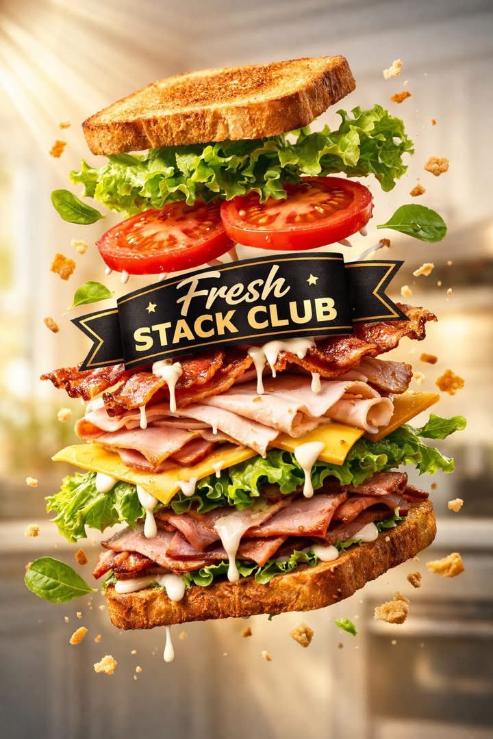 "High-end commercial product photography of a ({argument name="product type" default="sandwich"}) labeled “({argument name="product name" default="Fresh Stack Club"})”, floating mid-air in a layered ({argument name="view style" default="exploded tilt view"}), vibrant (multi-layer textures) with sauce dripping realistically. Surrounded by flying (lettuce, tomato, bread crumbs). Background features a cinematic (bright kitchen gradient) with soft sunlight rays and depth blur for a fresh, healthy ad look"Related Nano Banana Pro Prompts