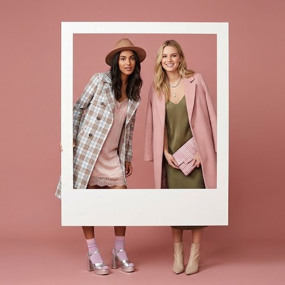 A high-resolution studio photograph featuring two female models posing against a solid dusty rose background. On the left, a model with dark hair wearing a light brown felt fedora hat, a patterned plaid trench coat in shades of light blue, white, and brown over a pale pink lace-hemmed slip dress, and silver metallic chunky-heeled platform sandals with pastel pink socks. On the right, a blonde-haired model wearing an open solid pale pink long coat over an olive green slip dress, holding a pink and white checkered patterned clutch bag, and a silver necklace, and wearing light beige pointed-toe ankle boots. The models are centered within a large, empty white square polaroid-style frame, as if it is a physical prop framing their upper bodies and heads, with their legs and shoes extending below the frame, still against the dusty rose background. Both models look directly and engagingly at the camera with warm expressions. The lighting is soft and even, highlighting the textures of the fabrics. The composition is clean and focused solely on the models, their apparel, and the central white frame, with all surrounding space being a clean, uninterrupted dusty rose color. The style is a minimalist fashion editorial photograph.
