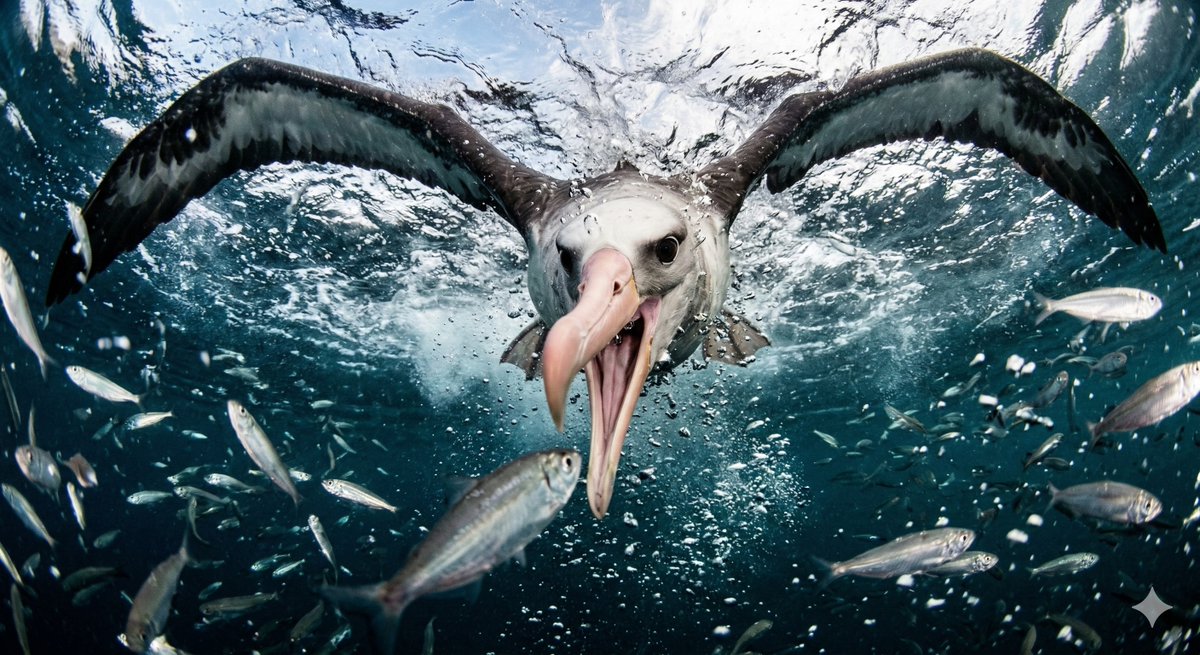 A creative and humorous prompt for generating a fisheye lens photograph taken from the perspective of a fish that is about to be eaten by a seagull.