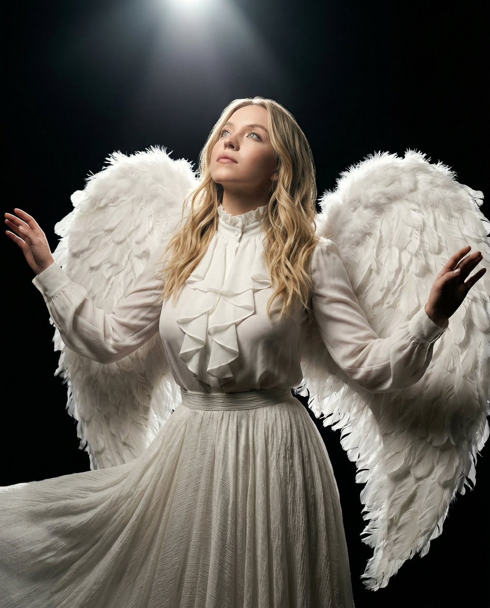 Studio portrait of a young woman seated on the floor against a soft gray gradient backdrop. She wears a luxurious white silk blouse and tailored wide-leg trousers, paired with large white feather angel wings rising behind her. Legs folded to the side, hands resting gently on her knees, shoulders relaxed, head slightly tilted with a calm, soft gaze toward the camera. Medium-length black wavy hair framing her face. Focused spotlight from above creating a subtle halo effect with soft falloff into shadows. Clean minimal studio environment with visible feather texture and natural skin detail. Editorial fashion photography style, 85mm lens, shallow depth of field, aspect ratio 4:5. Prompt 2. Studio portrait of a young woman standing against a black background, wearing an elegant white ruffled high-neck blouse with long sleeves and a matching flowing textured skirt, paired with large white feather angel wings extended behind her. Arms raised softly to the sides, head tilted upward toward the light with a serene, almost divine expression. Soft blonde wavy hair cascading over her shoulders. Strong directional spotlight from above-left creating dramatic highlights on her face and wings with deep surrounding shadows. High contrast with glowing feather detail and soft skin texture. Cinematic editorial fashion style, 85mm lens, shallow depth of field, aspect ratio 4:5. Prompt 3. Elegant interior portrait of a young woman seated on a grand piano in a classic ornate room with tall arched windows and soft daylight streaming in. She wears an elegant fitted ivory evening gown with intricate beadwork and delicate heels, paired with large white feather angel wings spread behind her. Legs crossed, one hand resting on the piano, shoulders relaxed, head slightly tilted with a soft, confident gaze. Styled dark wavy hair with a vintage finish, pearl choker necklace. Natural window light from the left creating soft highlights and gentle shadows across her face and wings. Warm neutral tones with detailed fabric and feather texture. Luxury editorial fashion photography style, 85mm lens, shallow depth of field, aspect ratio 4:5. Prompt 4. Foggy outdoor portrait of a young woman crouching on the hood of a worn silver car in an abandoned industrial setting. She wears a sleek black leather motorcycle jacket over a fitted dark turtleneck and tailored pants, paired with large black feather wings spread behind her. Body low and balanced, arms resting over her knees, head slightly tilted forward with an intense, direct gaze. Long messy blonde hair with soft movement. Cool desaturated tones with heavy mist softening the background, faint silhouettes of debris and structures. Natural diffused light through fog creating soft contrast and muted highlights on the wings and metal surface. Cinematic dark fantasy fashion style, 85mm lens, shallow depth of field, aspect ratio 4:5.