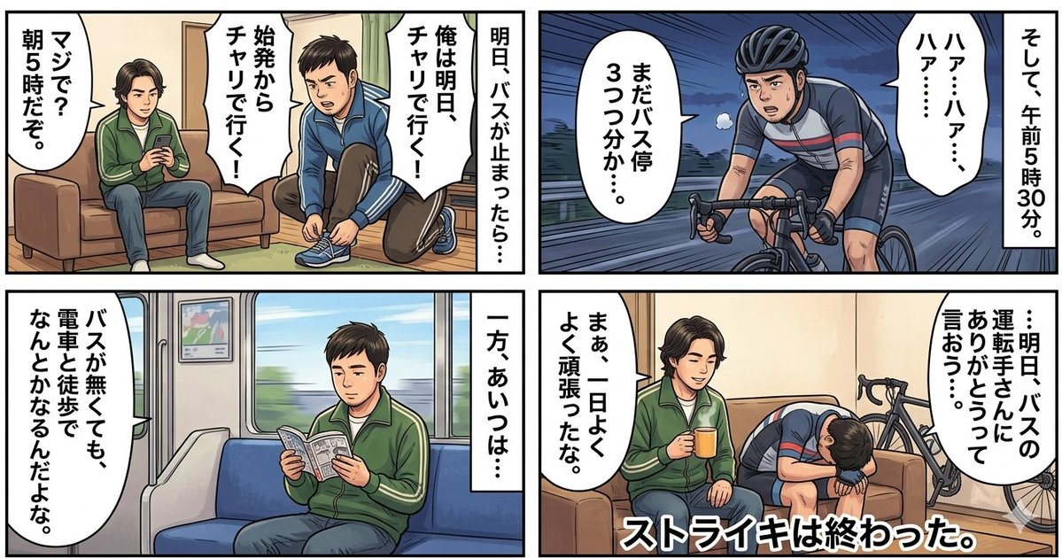 AI Image Generation 4-panel manga Title If the bus stops tomorrow (March 27th)... Reiwa Roman Roman = Madness The Bicycle Rhapsody (Capriccio) Begins... and then...