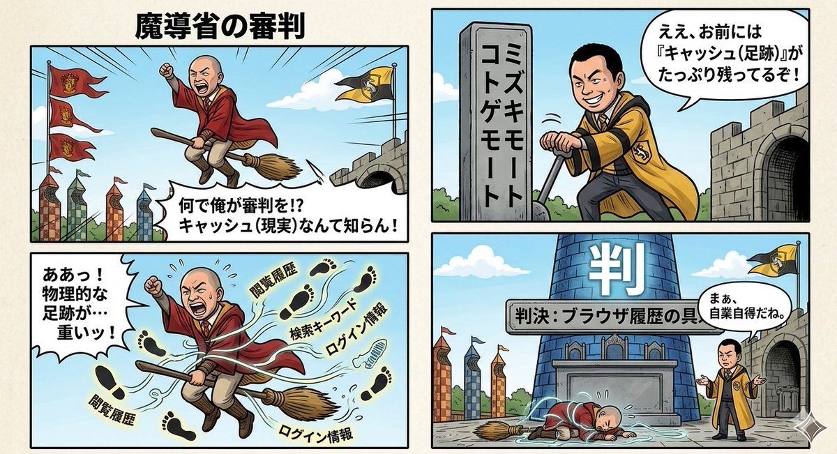 A prompt for Nano Banana Pro (Gemini 3 Pro Image) to generate a four-panel manga titled 'Judgment of the Ministry of Magic,' focusing on the concept of 'cache' (reality) versus 'cache' (footprints) and the weight of cache.