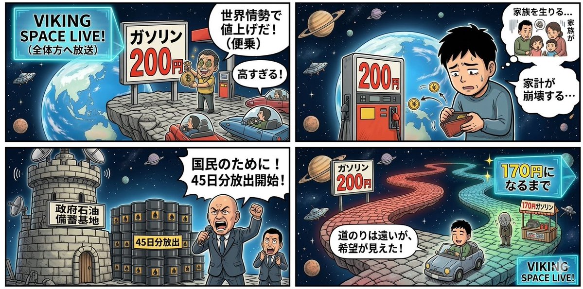 4-panel manga Title: 'Oil Rush Panic' Viking? Only Eiji Kotouge Barely... Others changed characters