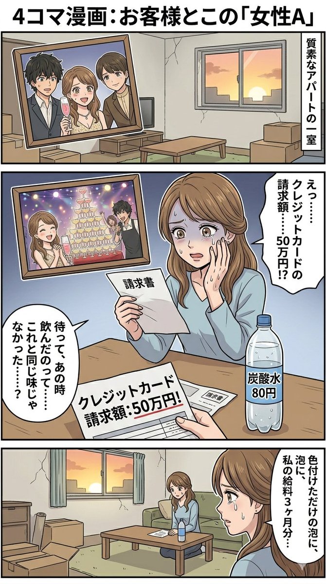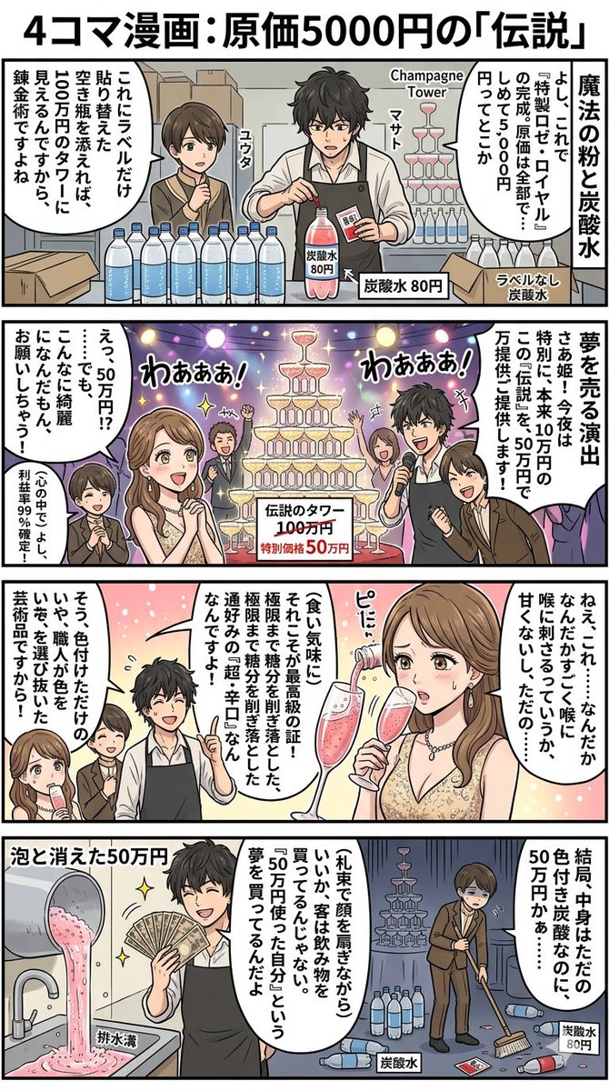 This is the title and key phrases used to generate a four-panel manga image using Nano Banana Pro, focusing on the theme of 'The Legend of the 5000 Yen Cost' and the high-profit margin of a 500,000 yen champagne tower costing only 5,000 yen.
