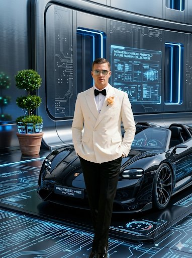 A JSON prompt for generating a high-fashion editorial portrait of a man in a cream tuxedo blazer and aviator sunglasses, set in a futuristic cyberpunk showroom with neon circuitry, holographic displays, and a sleek electric supercar.