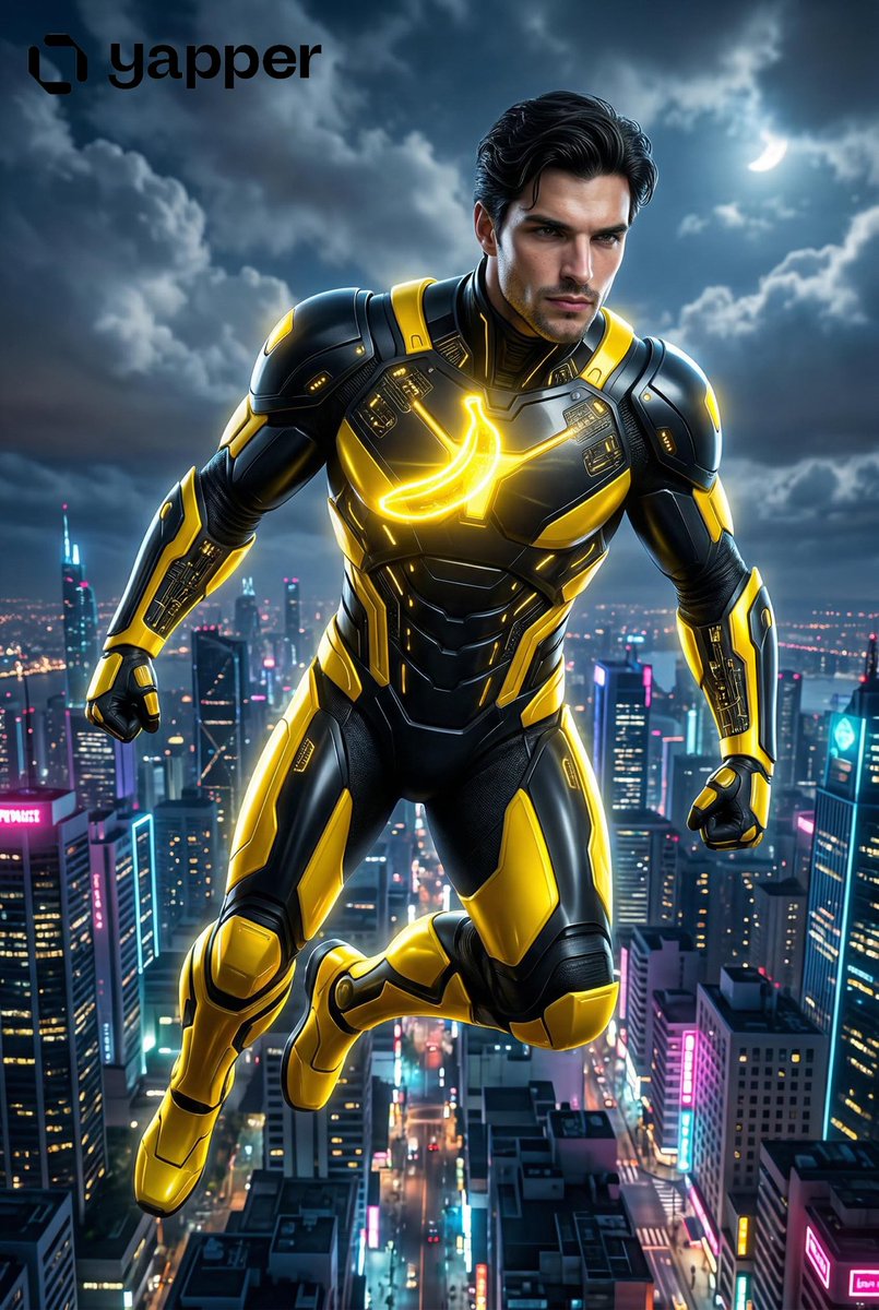 Use my photo as reference, transform me into a futuristic superhero called {argument name="superhero name" default="Nano Banana"}, glowing {argument name="suit color" default="yellow and black"} nano suit, banana shaped energy emblem on chest, cinematic lighting, flying above a neon city, ultra realistic, dramatic clouds, 8k, sharp focus, heroic poseRelated Nano Banana Pro Prompts
