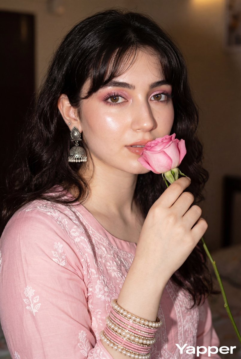 Close-up glamorous portrait of a young woman wearing a soft pink traditional outfit with delicate embroidery, layered pearl and pink bangles, and ornate silver earrings. She holds a fresh pink rose near her face, partially covering her lips in one pose and gently holding it below her chin in another. Soft glossy makeup with pink shimmer eyeshadow, winged eyeliner, long lashes, glowing dewy skin, and glossy lips. Dark wavy hair with bangs framing her face. Shot with direct on-camera flash for a dramatic, high-shine, editorial beauty look. Intimate framing, sharp focus on eyes, rich contrast, warm indoor background, ultra-detailed, high resolution.