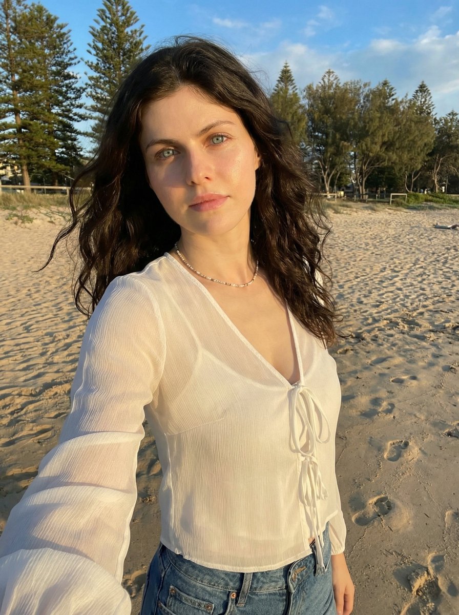 "pose": "selfie-style pose with arm extended toward camera, torso slightly angled, shoulders relaxed, head slightly tilted with natural posture",