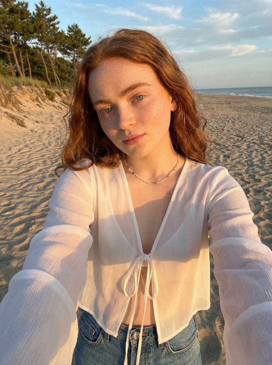 A detailed prompt for generating an ultra-realistic, golden hour beach selfie, focusing on natural sunlight, realistic skin texture, specific clothing details, and maintaining the exact identity of the subject from an uploaded reference image.