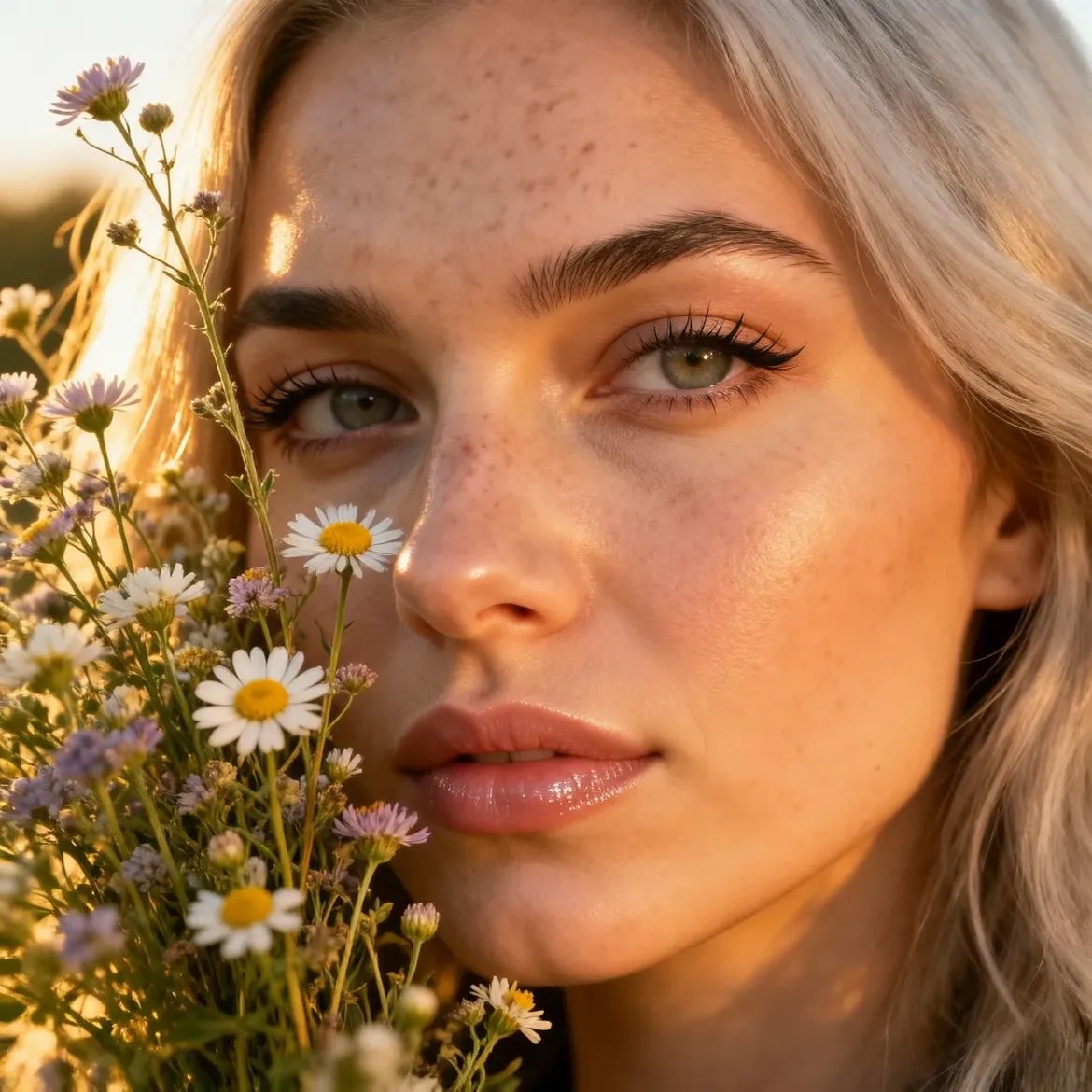 Ultra-realistic close-up portrait of a young woman with {argument name="hair color 2" default="blonde"} hair and light freckles holding a small bouquet of daisies near her face, glowing skin, glossy lips, green eyes, warm golden hour sunlight illuminating her face, soft natural makeup, outdoor meadow setting, shallow depth of field, macro portrait photography, cinematic lighting, 85mm lens, f/1.8, highly detailed, photorealistic, soft bokeh backgroundRelated Nano Banana Pro Prompts