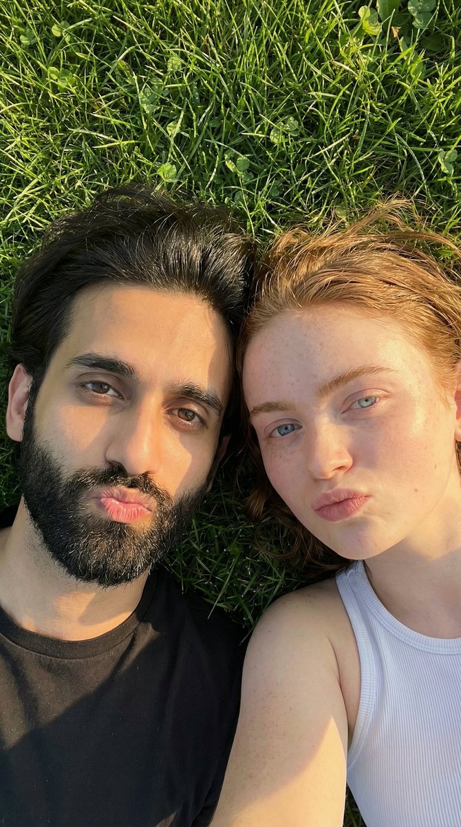 A hyper-realistic selfie prompt for a couple lying on grass, focusing on identity preservation from a reference image.