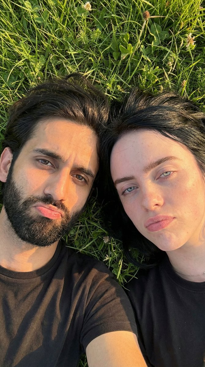Use 100% uploaded image face details, Create a hyper-realistic selfie photo of {argument name="subjects" default="a couple (man and woman)"} with faces 100% identical to the uploaded reference, lying side by side on {argument name="background" default="fresh green grass"}, captured from a top-down angle. Their expressions are {argument name="expression" default="natural Pouting or making a playful frown"}.