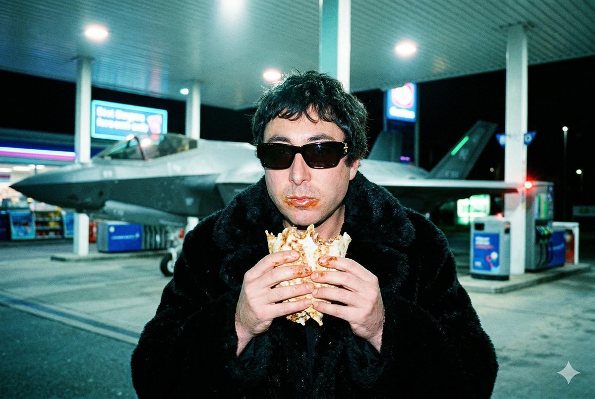 STYLE: Grainy, unedited paparazzi night snapshot, underground fashion photography. SUBJECT: Man frozen mid-bite eating a doner kebab, sauce smeared, detached expression. (Maintain hair exactly as reference image). WARDROBE: Oversized black fur coat, dark designer sunglasses. BACKGROUND: Car gas station at night. A Lockheed Martin F-35 Lightning II military fighter jet is parked at the pumps with glowing navigation lights. LIGHTING & CAMERA: Harsh camera flash, bright highlights, deep shadows, cool blue-and-white neon reflections. Imperfect composition. Use aspect ratio 3:2