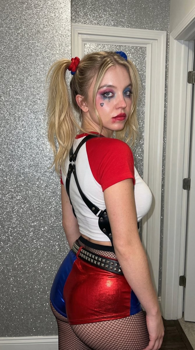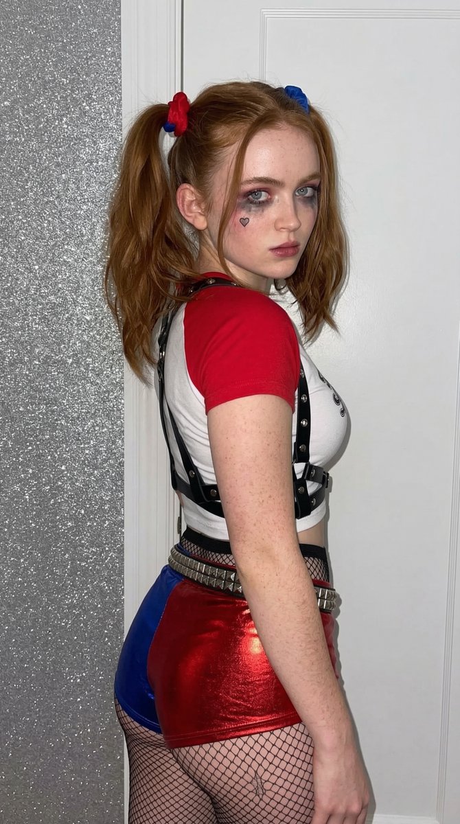 "description": "Young American Woman with a buxom and curvy figure in a Harley Quinn cosplay theme, featuring an oval-to-heart-shaped face and a fair complexion.",