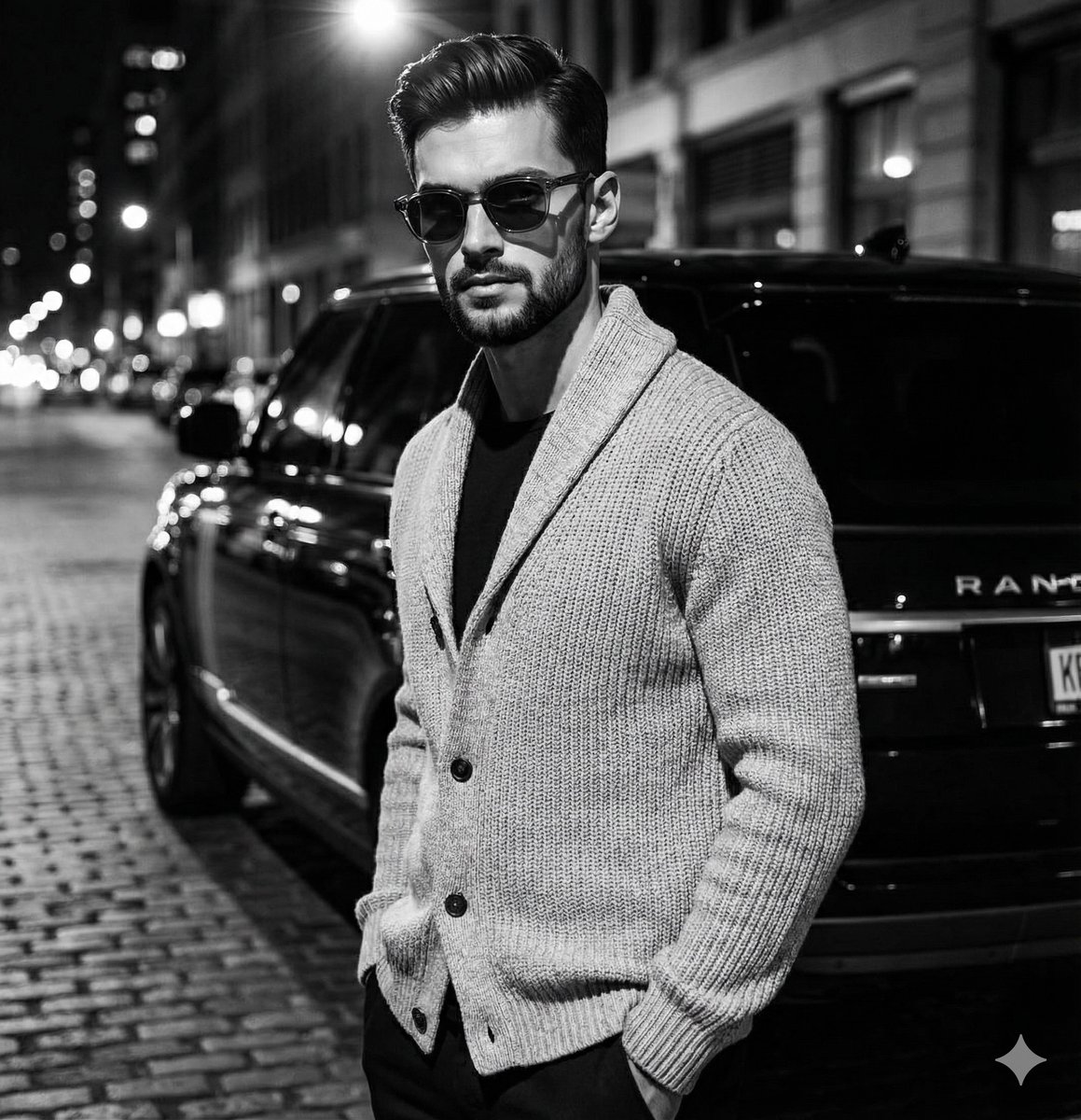 "primary_subject": "Male model with rugged features, stubble beard, wearing translucent-frame sunglasses and a thick knit button-up cardigan over dark trousers",