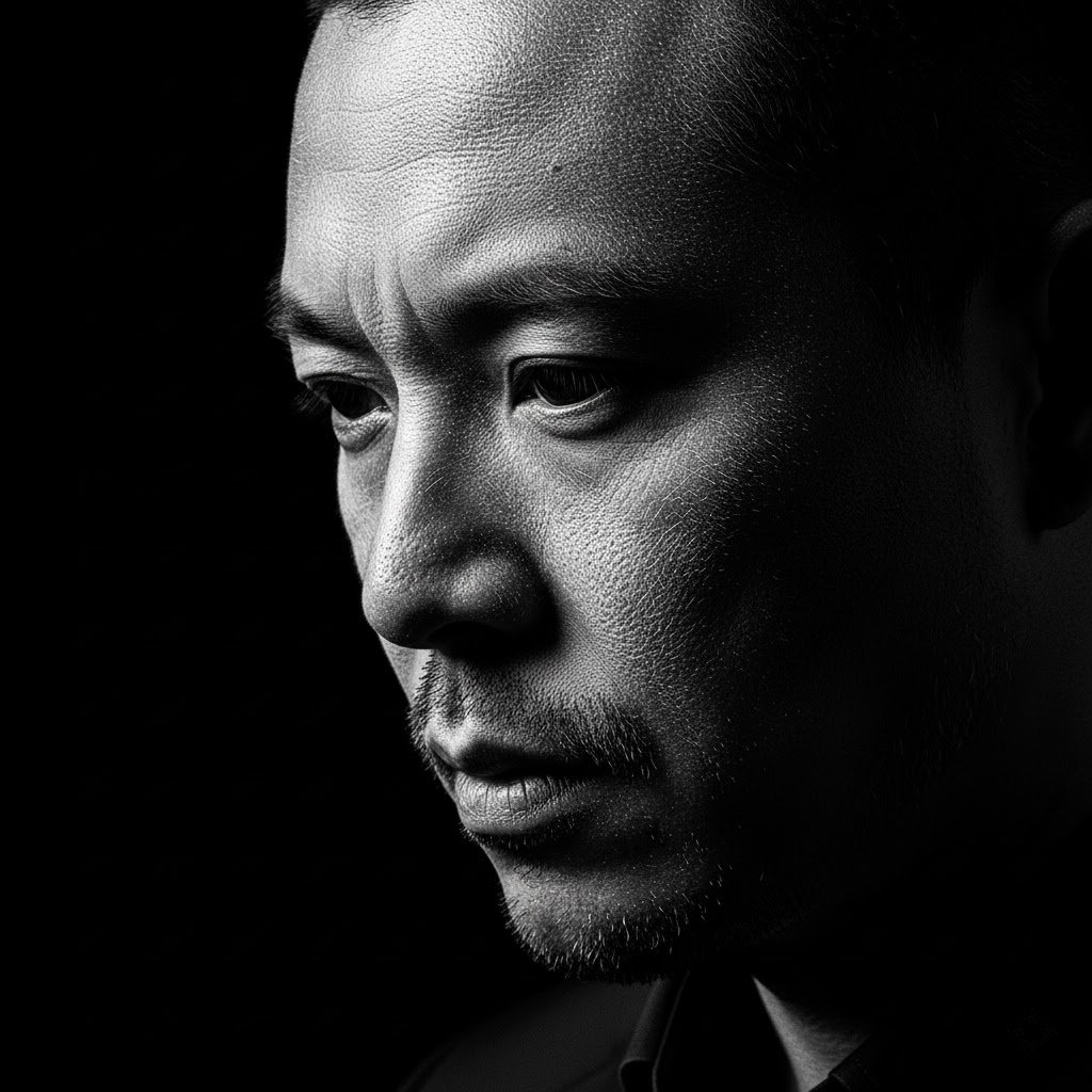 A dramatically powerful 8K high-definition black and white portrait, employing a high-contrast scratching or woodcut style, showcases a close-up of a man's face (100% based on the facial features of the person in the uploaded image). He is looking down, his eyes possibly closed or drooping. The image emphasizes the texture of his skin, depicting pores, wrinkles, and stubble with fine lines, especially around the nose, mouth, and forehead. The extremely strong and directional light creates sharp highlights on the bridge of the nose, forehead, and lips, while deep black shadows are created in the background and surrounding areas, thus highlighting his facial contours. The overall effect conveys a sense of deep introspection or solemnity, with the fine lines adding a tactile quality.