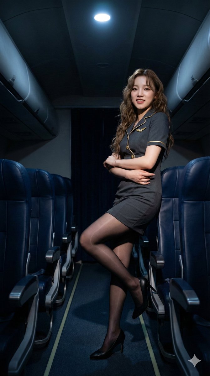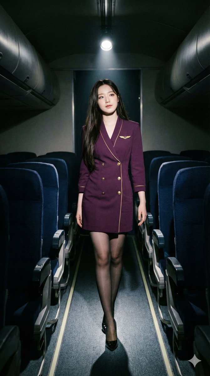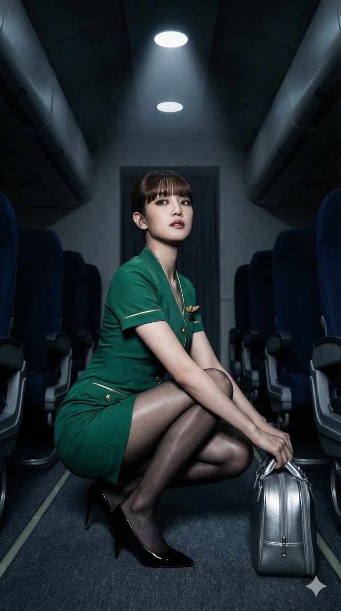 "technical_prompt": "Photorealistic, 8k resolution, shot on 35mm lens, f/1.8, cinematic film grain, volumetric lighting, ray-traced reflections on floor and hosiery, hyper-detailed fabric textures, Moka-style AI art aesthetic, sharp focus on subject, soft bokeh on distant cabin seats, --ar 9:16"