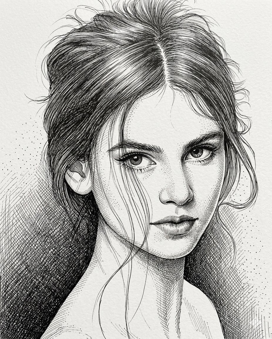 A prompt for Gemini Nano Banana to generate a high-contrast pen and ink portrait of a young woman, using intricate cross-hatching and stippling techniques to create depth, mimicking a technical drawing on textured paper.
