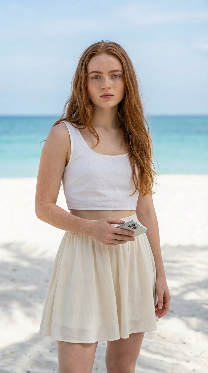 A high-end aesthetic lifestyle photo of a young woman standing on a bright white sand beach with a clear turquoise ocean and soft blue sky in the background, use reference image face and preserve identity strictly, do not change facial features, proportions, skin tone, or expression, maintain exact likeness. Outfit: minimal summer outfit featuring a soft light-toned crop top and a flowy short skirt, lightweight fabric, clean and elegant style. Pose: natural confident stance, holding a smartphone casually in one hand, relaxed posture, direct gaze toward camera. Lighting: bright natural daylight, soft sunlight evenly illuminating skin, clean highlights, no harsh shadows, slightly diffused light for smooth skin tones. Environment: tropical beach setting with clear horizon line, calm ocean, minimal distractions, soft shadows from nearby elements (like tree leaves) lightly visible on sand. Camera: eye-level shot, 50mm lens, sharp focus on subject, shallow depth of field, background slightly softened but still visible. Style: ultra realistic, high-fashion summer aesthetic, clean and minimal composition, fresh and airy mood, Instagram/editorial style. Quality: 8k, HDR, photorealistic, high detail, natural skin texture, crisp clarity.