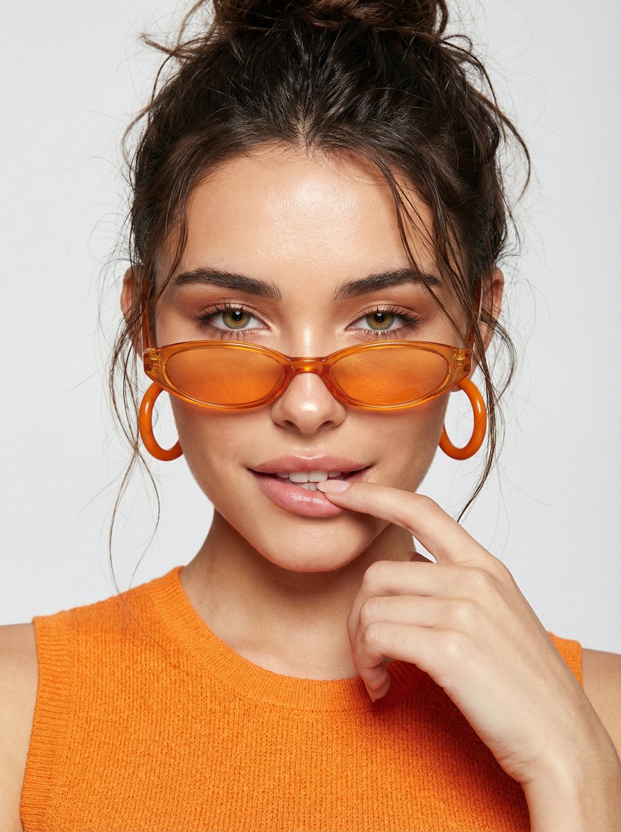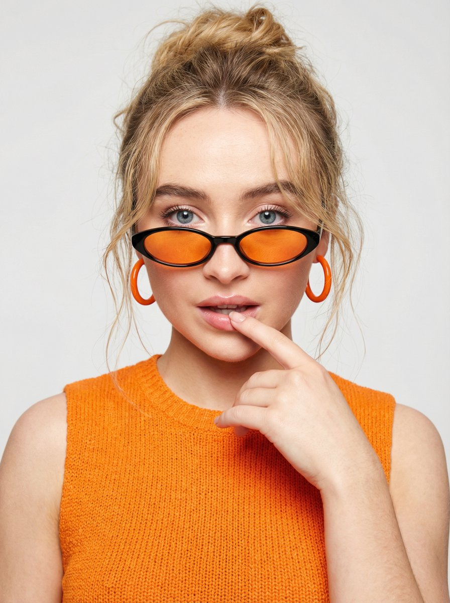 "sunglasses": "narrow oval sunglasses, black frame with vivid orange tinted lenses, worn low on the nose below the eyes"