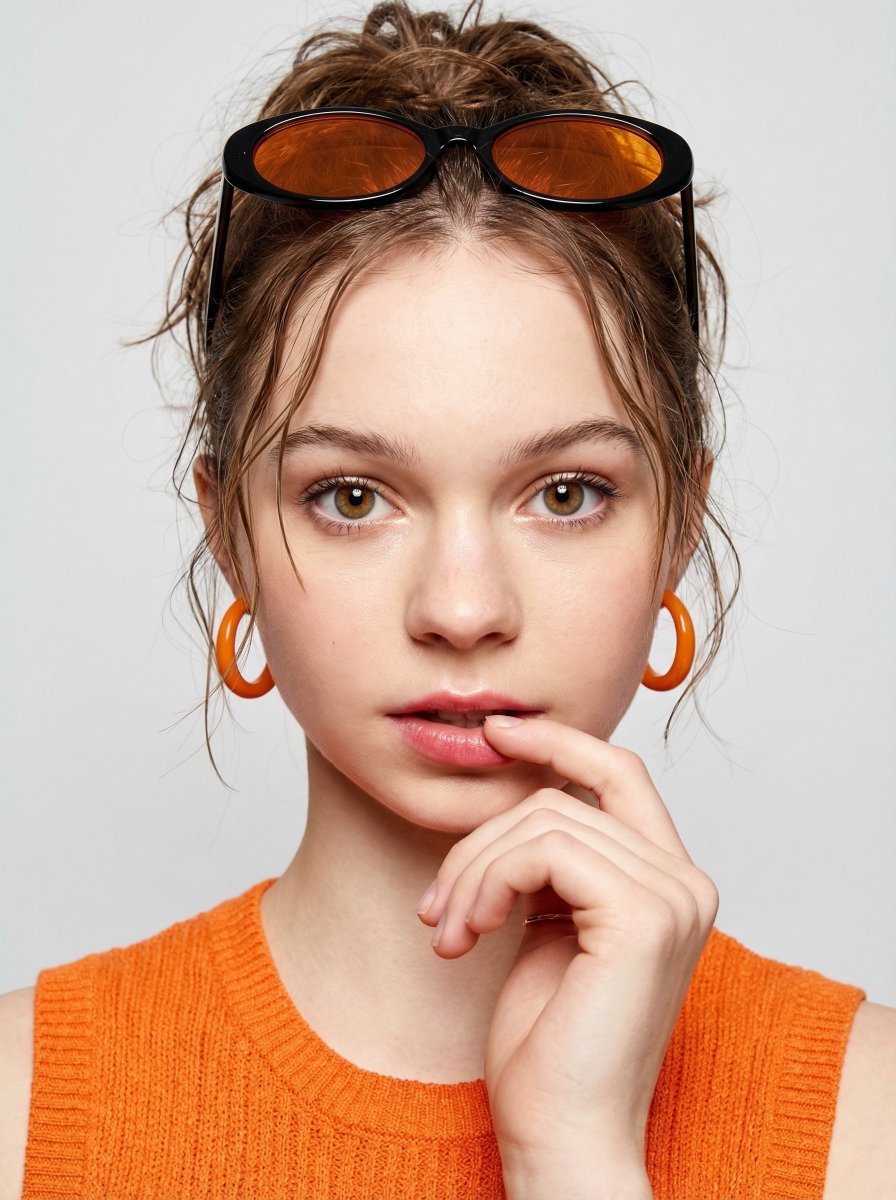 A highly structured JSON prompt for Nano Banana Pro to generate an ultra-detailed, high-fashion editorial portrait. The prompt requires using a reference image for the subject's identity and facial features, focusing on a playful expression, a messy updo, and vivid orange accents in the outfit (sleeveless knit top) and accessories (hoop earrings, narrow sunglasses with orange lenses). It specifies bright, soft studio lighting and an 85mm lens for a crisp, clean look.