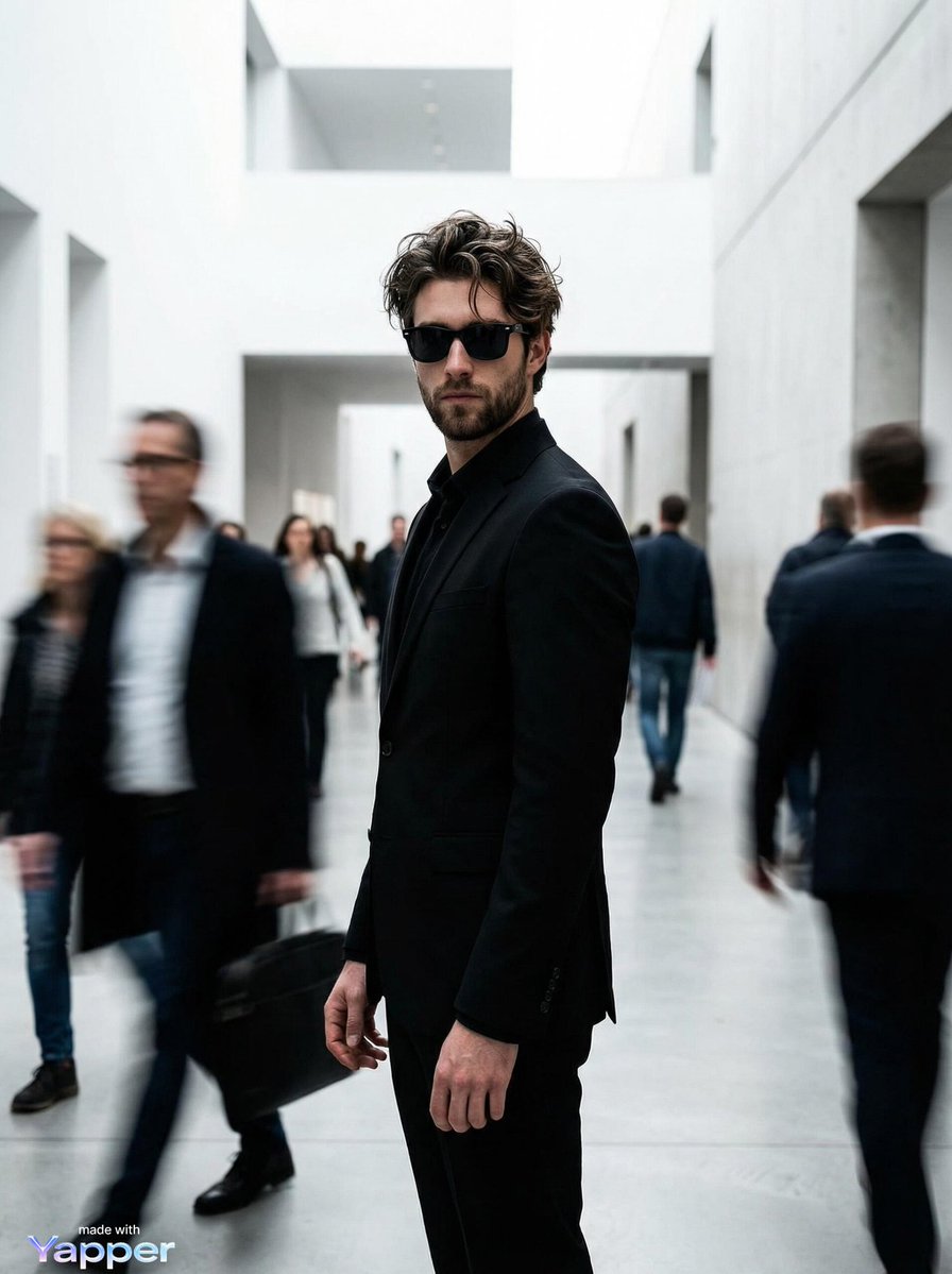 A stylish man standing still in a crowded modern hallway, wearing a black suit and black sunglasses, messy wavy hair, serious expression, people walking past him with strong motion blur, shallow depth of field, cinematic lighting, minimalistic white architecture in the background, high fashion editorial style, dramatic contrast, ultra realistic, 85mm lens, f1.8, sharp focus on the man while the crowd is blurred, luxury magazine photography.