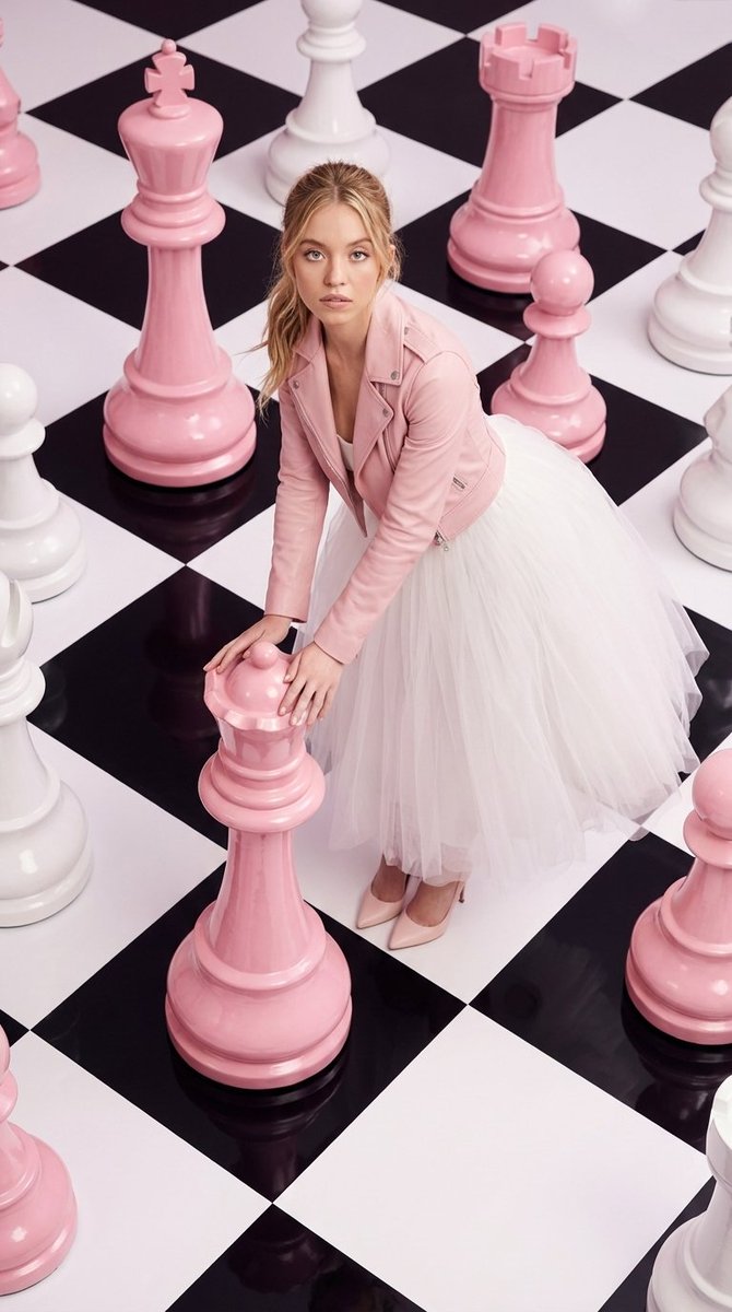 A high-fashion conceptual lifestyle photograph of a young woman placed inside a surreal chessboard environment. Use the provided reference image for the face and identity — strictly preserve exact facial structure, proportions, skin tone, eye color, and hair color. Do not alter identity, expression, or realism. The scene features a large-scale black-and-white checkered floor resembling a chessboard, surrounded by oversized glossy chess pieces in soft pink and white tones. The chess pieces are tall, smooth, and reflective, creating a surreal, dreamlike atmosphere. The woman is positioned slightly bent forward in a natural, interactive pose, gently touching or moving a large pink chess piece, as if engaged in a strategic moment. Her posture feels candid yet intentional. Outfit: a soft pastel pink leather jacket layered over a clean white top, paired with a delicate, flowy white tulle skirt. Light pink heels complement the outfit, maintaining a cohesive monochrome aesthetic. Hair & Styling: natural tied-back hairstyle with loose strands, soft makeup, clean and elegant look. Lighting: soft studio lighting with diffused highlights, subtle reflections on glossy chess pieces, balanced shadows, high-end editorial lighting style. Camera: top-down angled perspective (slightly elevated), 50mm lens, sharp focus on subject, geometric composition emphasizing symmetry and scale, background clean and controlled. Style: high-fashion editorial, surreal luxury aesthetic, minimal yet bold composition, pastel color grading, Instagram-worthy artistic direction. Quality: 8K, HDR, ultra-realistic, highly detailed textures, smooth skin tones, crisp focus, no distortion.